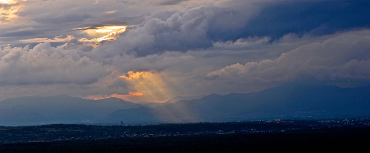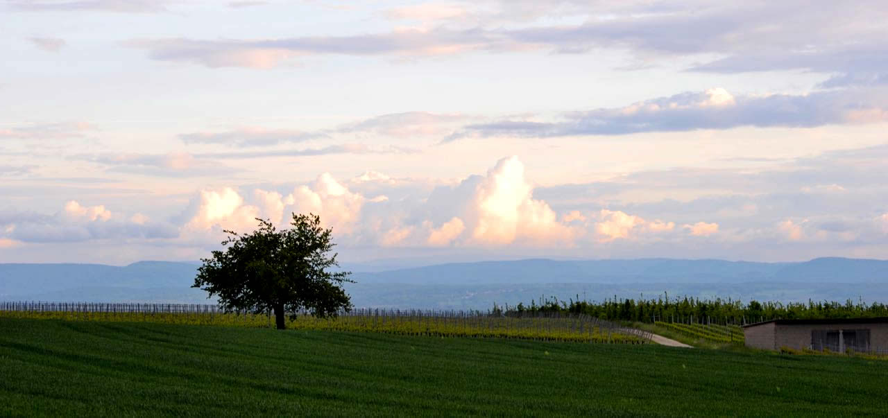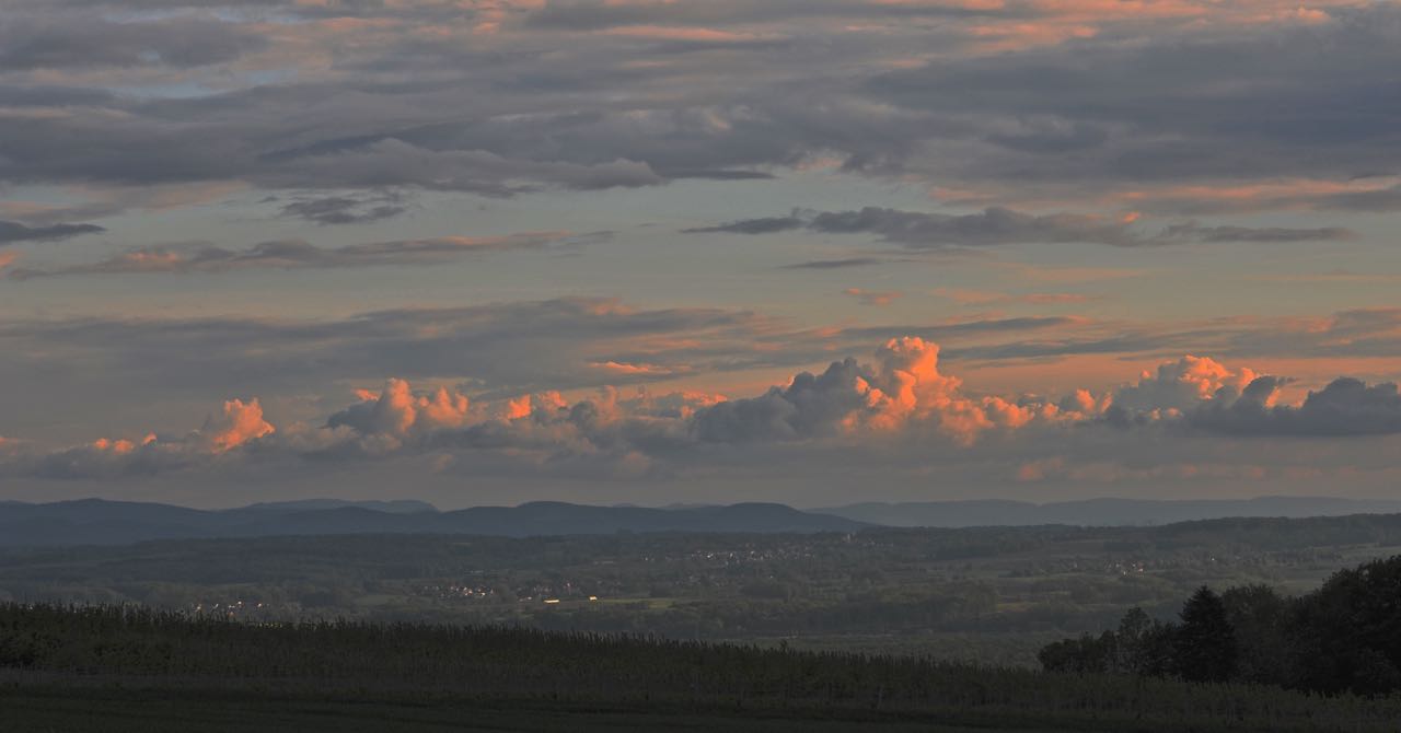Kurz vor der Einreise in die Schweiz wollen wir erneut nächtigen. Das Weingut Straub in Blansingen bietet einen Stellplatz samt Flammkuchen-Jause. Die Abendrunde mit Inou und Kira eröffnet uns einen phänomenalen Rundblick zum Sonnenuntergang samt prächtigem Wolkenspektakel.