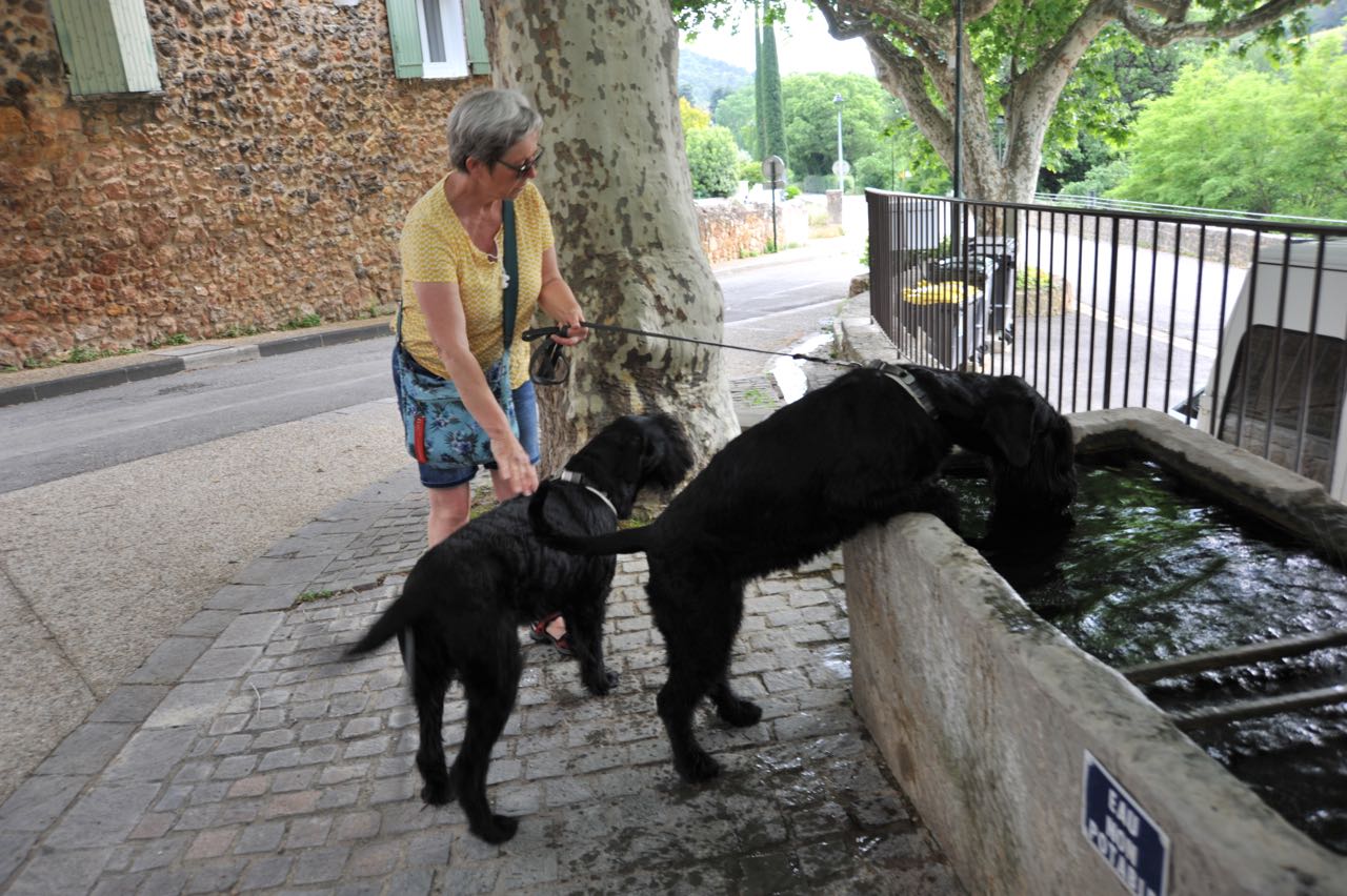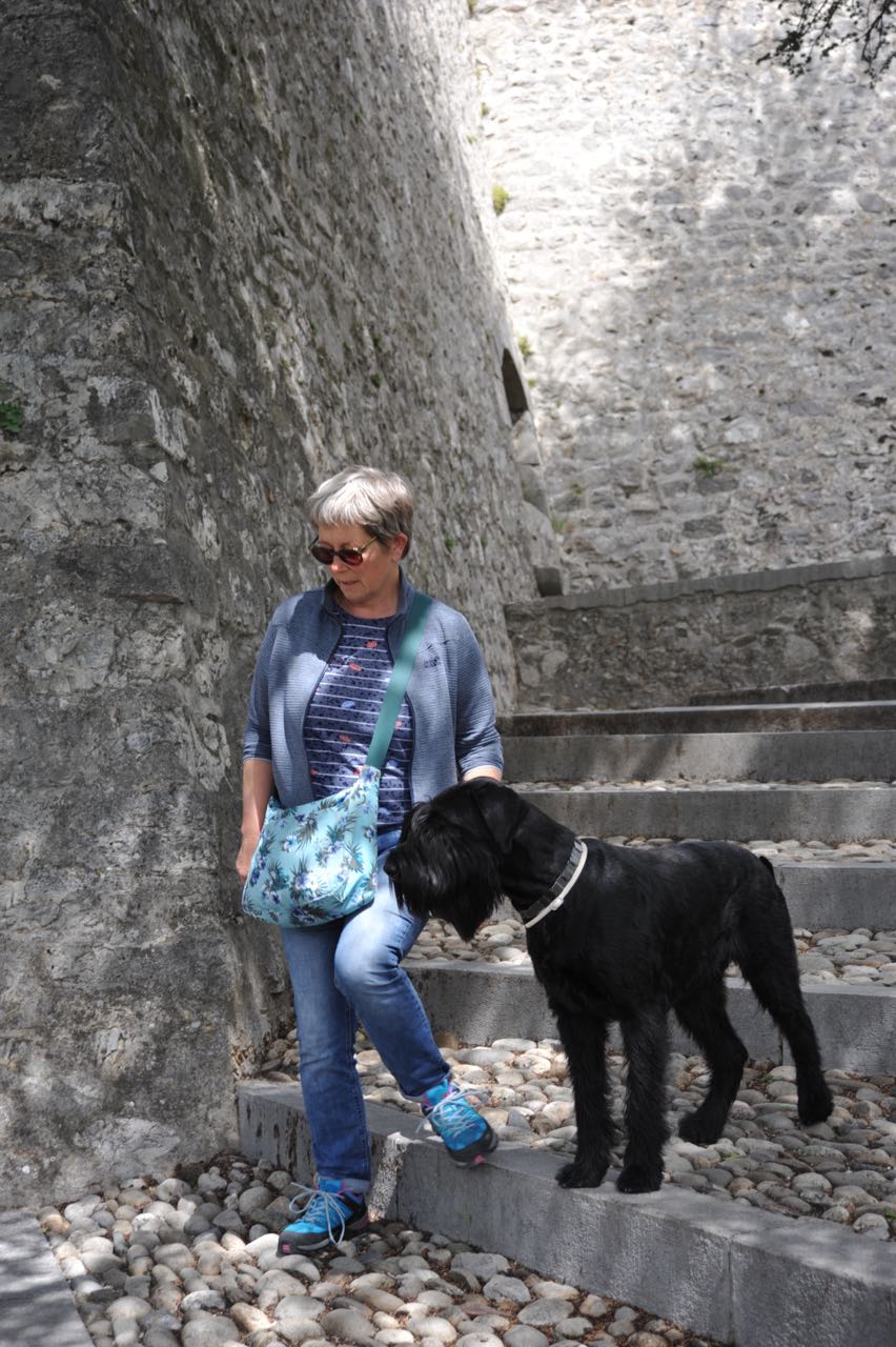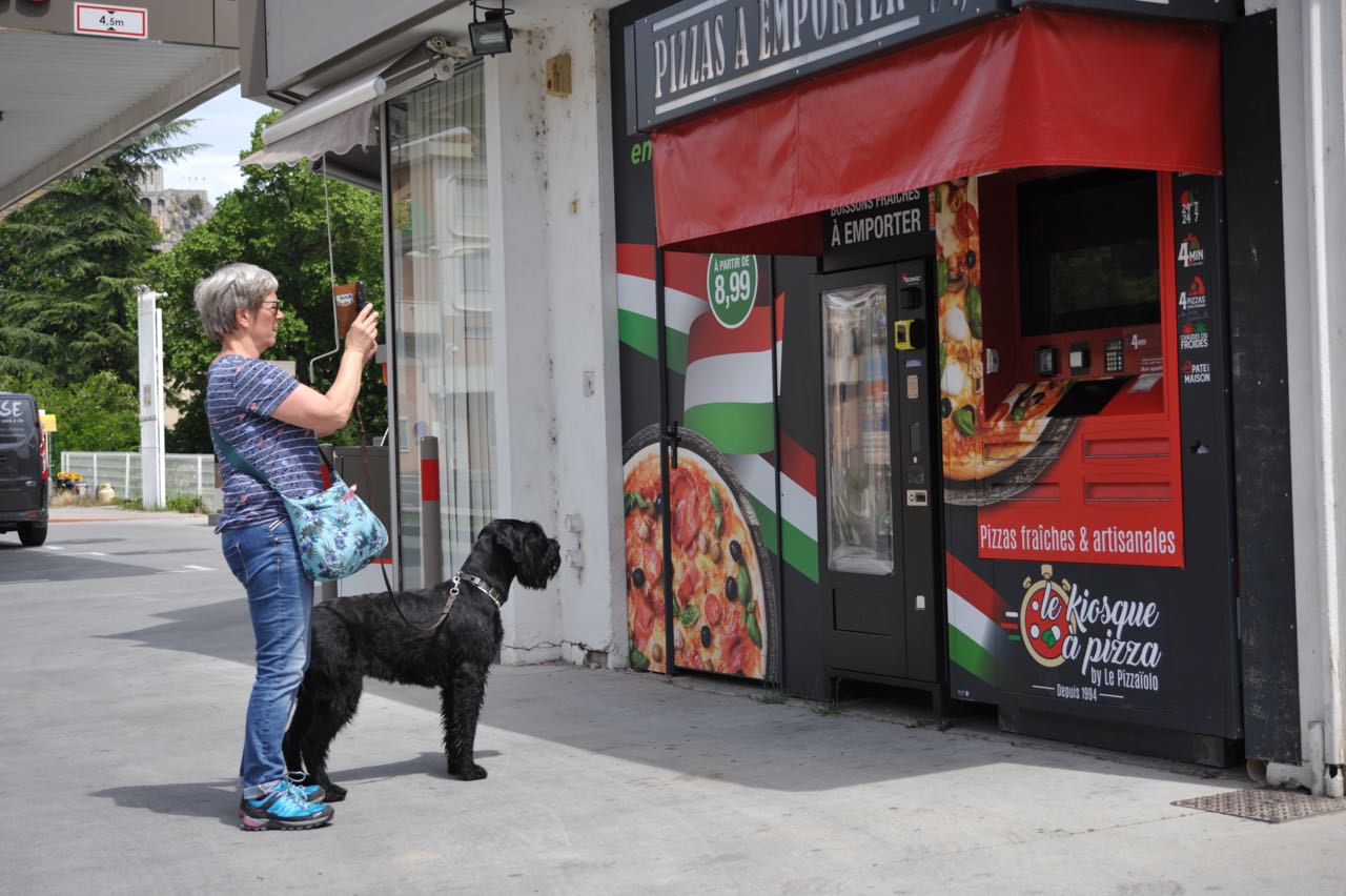 Ein Badestopp an der Teufelsbrücke (Pont du diable) gibt uns die Chance eines erfrischenden Bades in einem klaren Gebirgsbach. Über Grenoble geht es zur N75 in Richtung Sisteron. In Bahnhofsnähe finden wir auf dem Wohnmobilstellplatz eine Lücke. Der Charme des Platzes reicht gerade einmal für eine Übernachtung, sonst nichts. Die Stadt kann aufgrund ihrer außergewöhnlichen Lage an der Durance, der spektakulären Felsformationen und der grandiosen Festungsanlage gefallen. Eine Besichtigung mit Hunden ist möglich. Allerdings müssen Inou und Kira angeleint bleiben, denn die Wiesenflächen innerhalb der riesigen Burg werden von Schafen kurzgehalten. Nachmittags möchte Annette endlich eine Pizza aus dem Backautomaten probieren - Kira läßt das wohlriechende Etwas nicht aus den Augen.